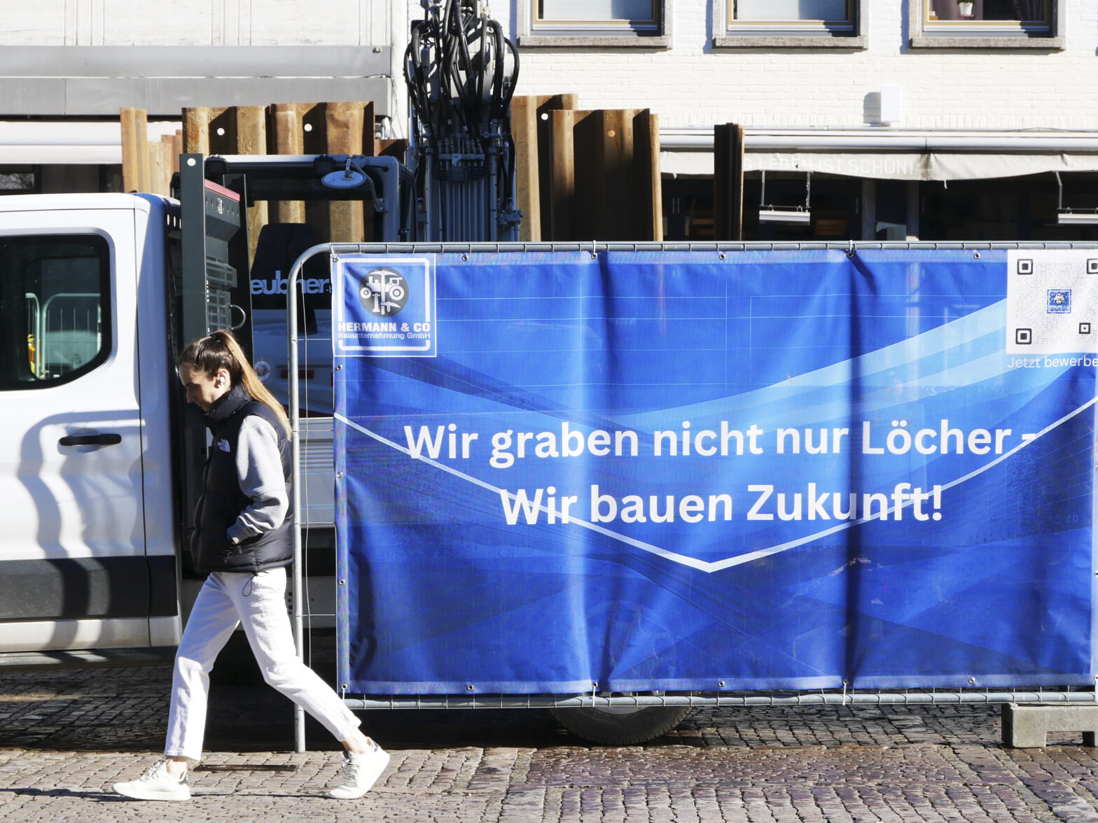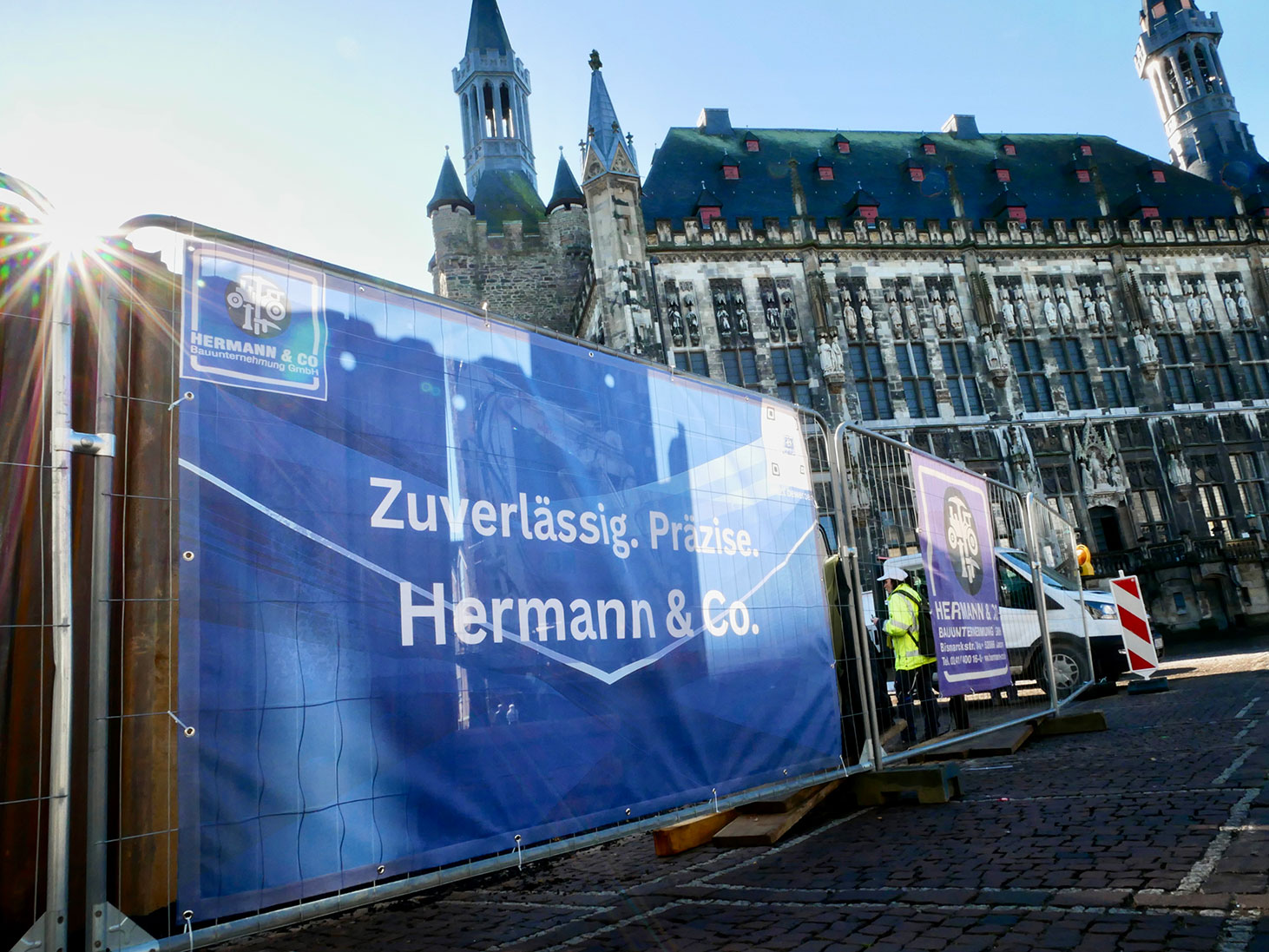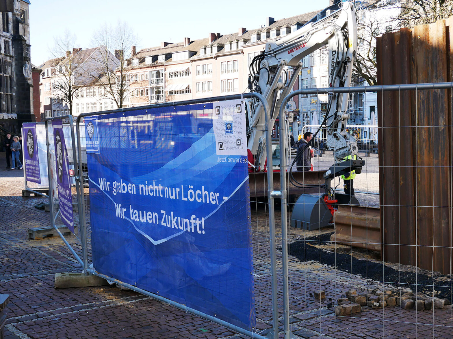 Bei der Baustelle am Aachener Markt haben wir den Bauzaun jetzt mit neuen, plakativen Bannern versehen. Diese „Hingucker“ dienen gleichermaßen der Imagewerbung wie zur Mitarbeiterakquise.