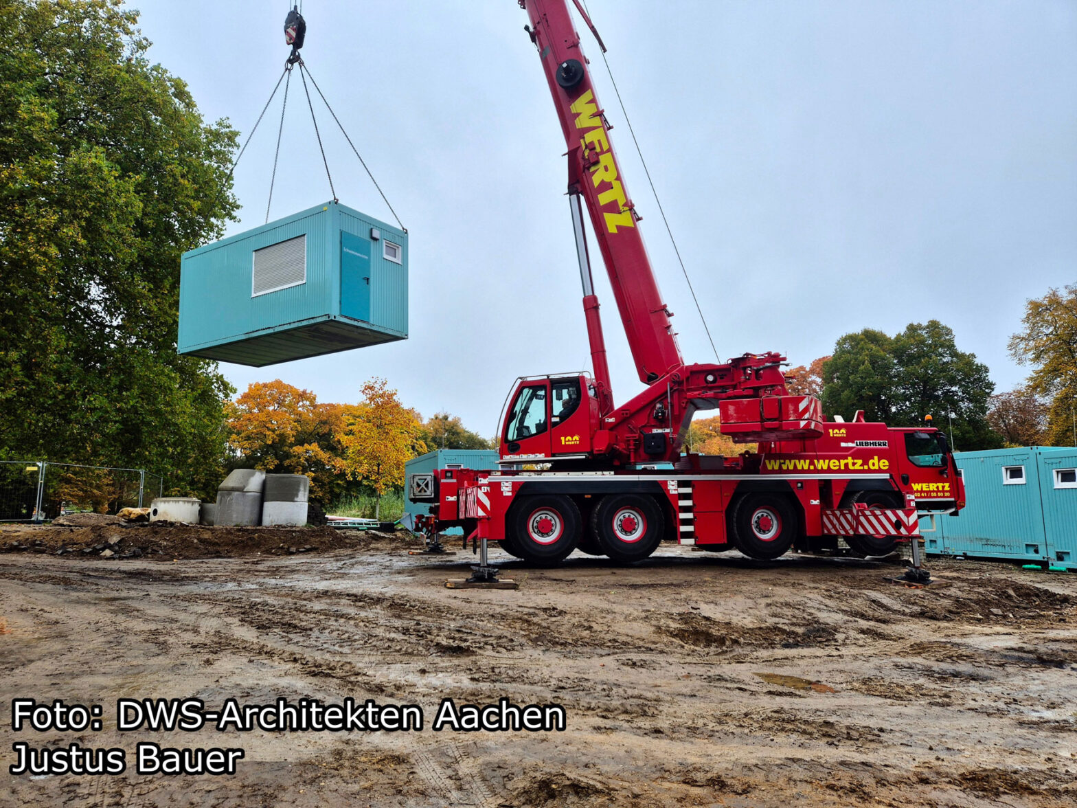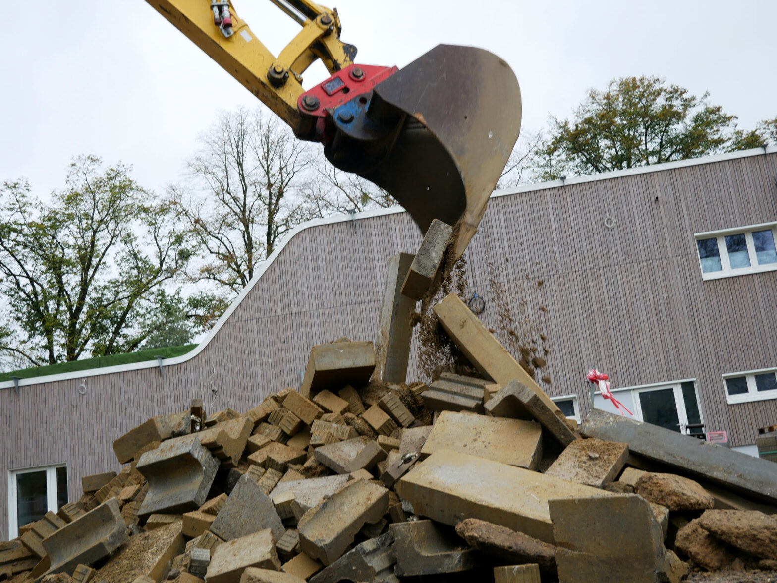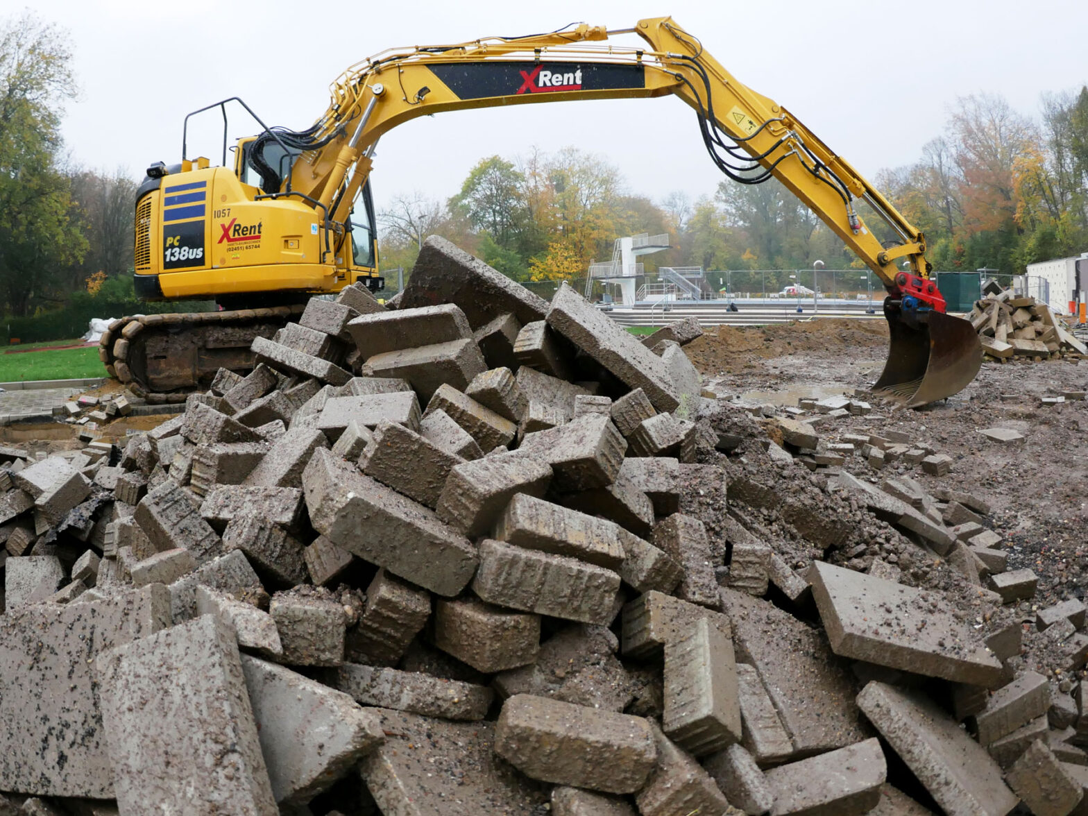 Der Gebäudeneubau am Aachener Freibad geht dem Ende entgegen. Somit hat die Interimslösung mit den Containern nun ausgedient. Nachdem die Stadt Aachen die Sondercontainer abbauen ließ, kümmern wir uns jetzt um den Rückbau der Pflasterflächen und die Erdarbeiten.