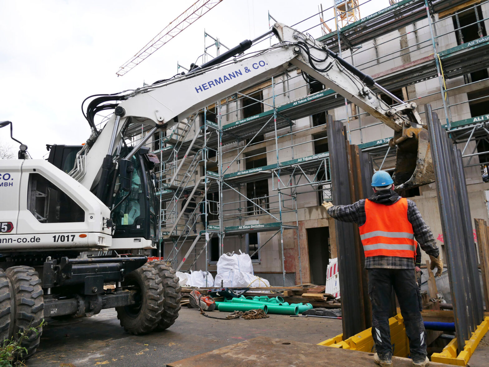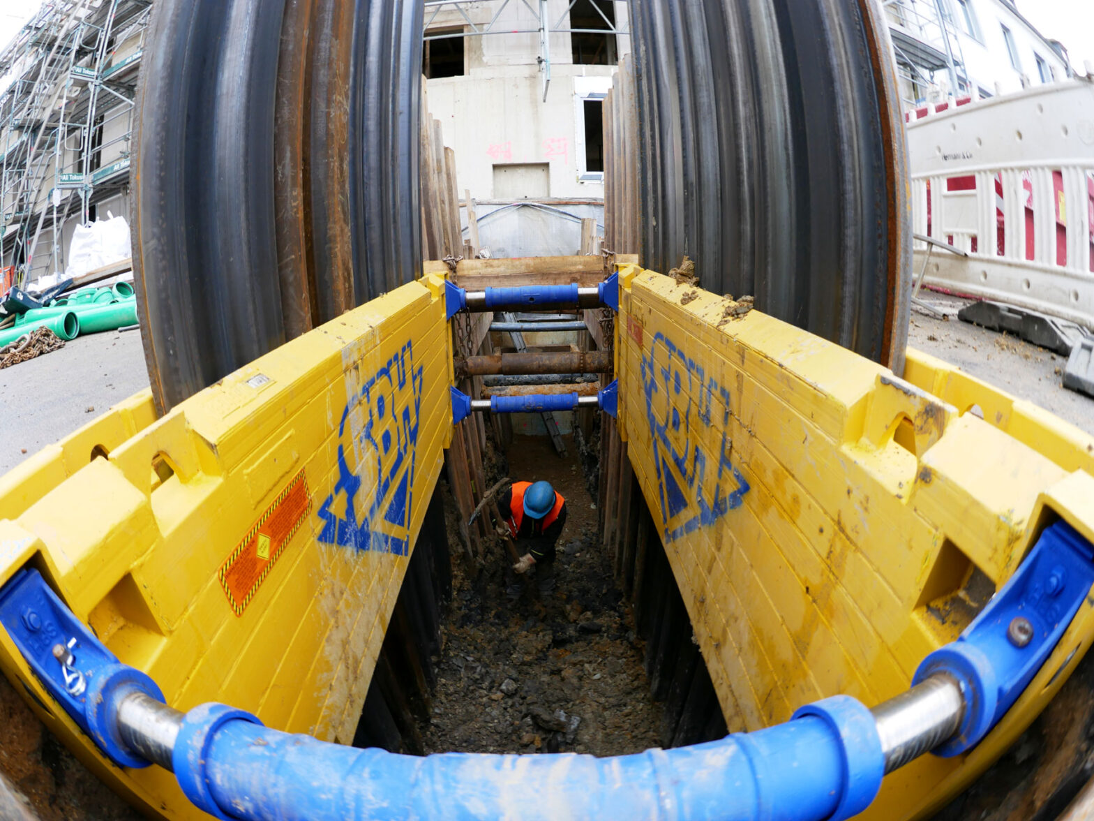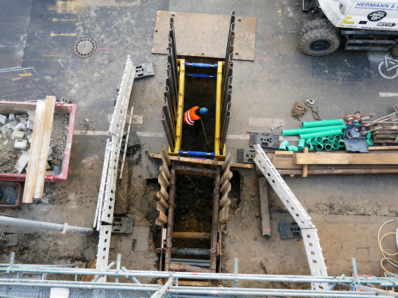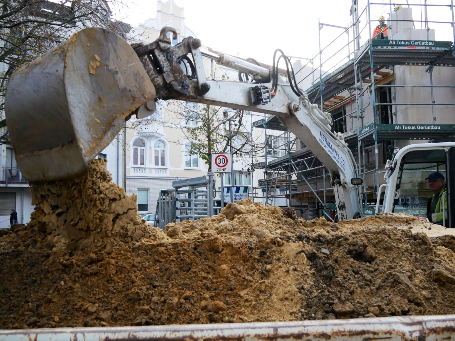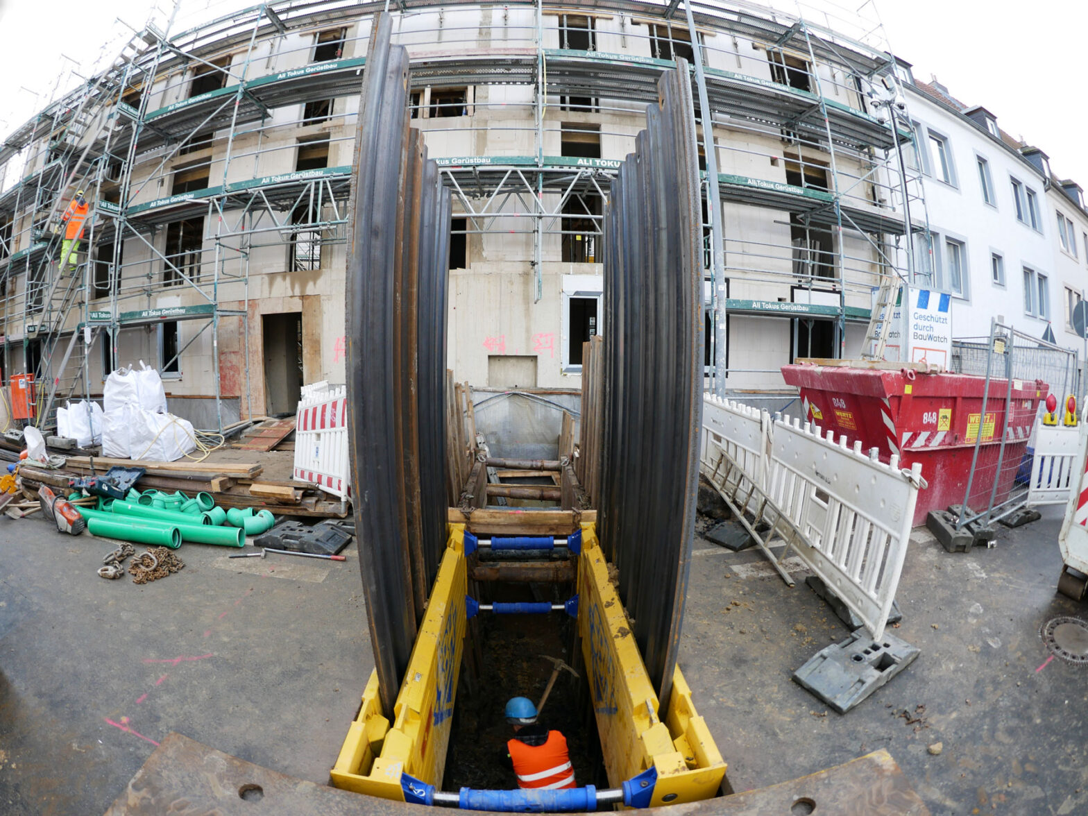 In der Aachener Beverstraße führen wir beim Neubau-Wohnprojekt „LIF – Leben in Frankenberg“ die Arbeiten für die Versorgungsleitungen durch. Über drei Zugänge werden die Hausanschlüsse für Strom, Wasser, Wärme sowie Telekommunikation verlegt.